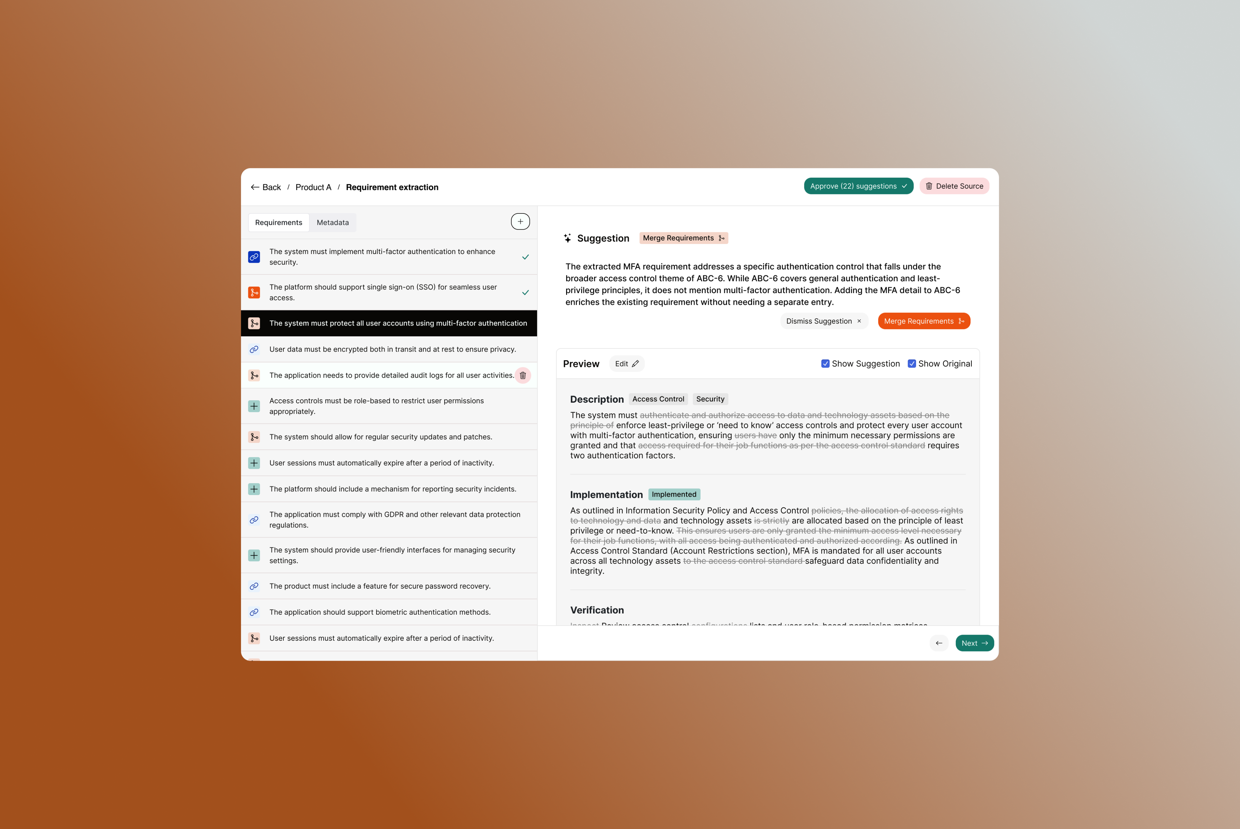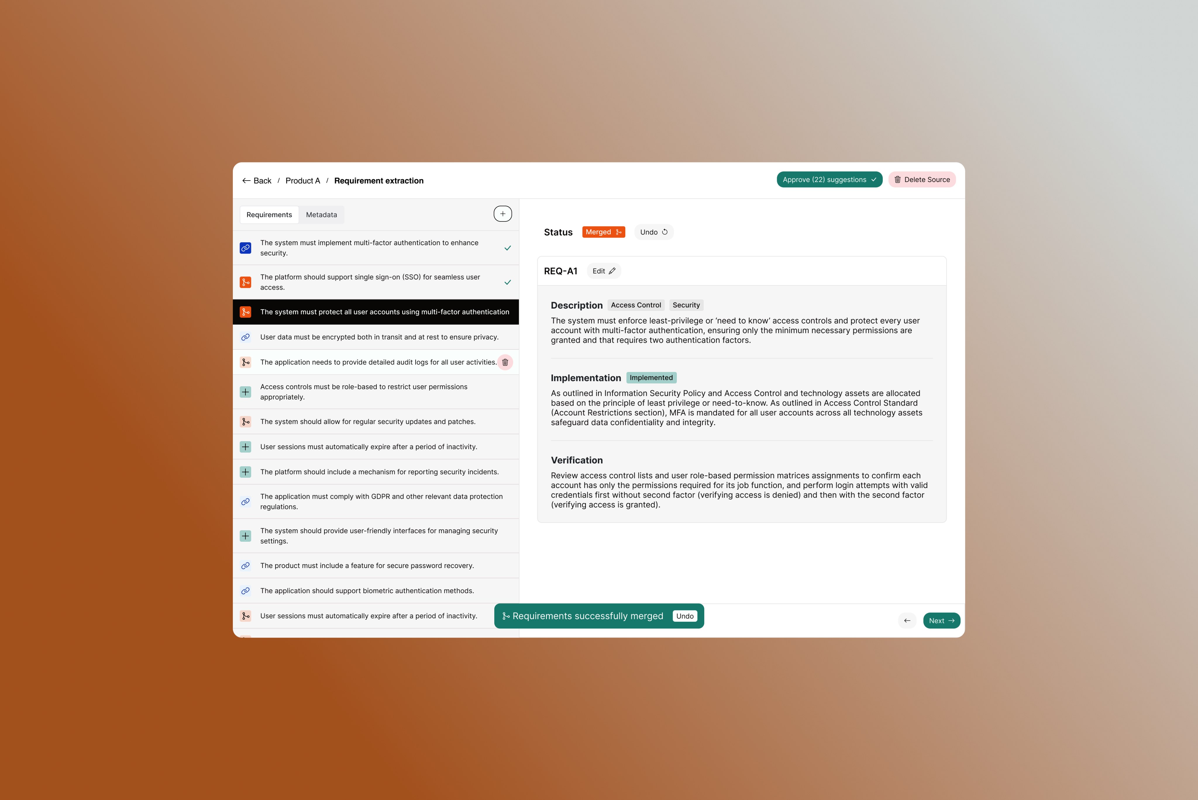 Rekwai will automatically read and understand your existing database to see if there are any related requirements. From here it will suggest the best next steps, including merging those requirements together to create one holistic requirement all while keeping the history of both single requirements.